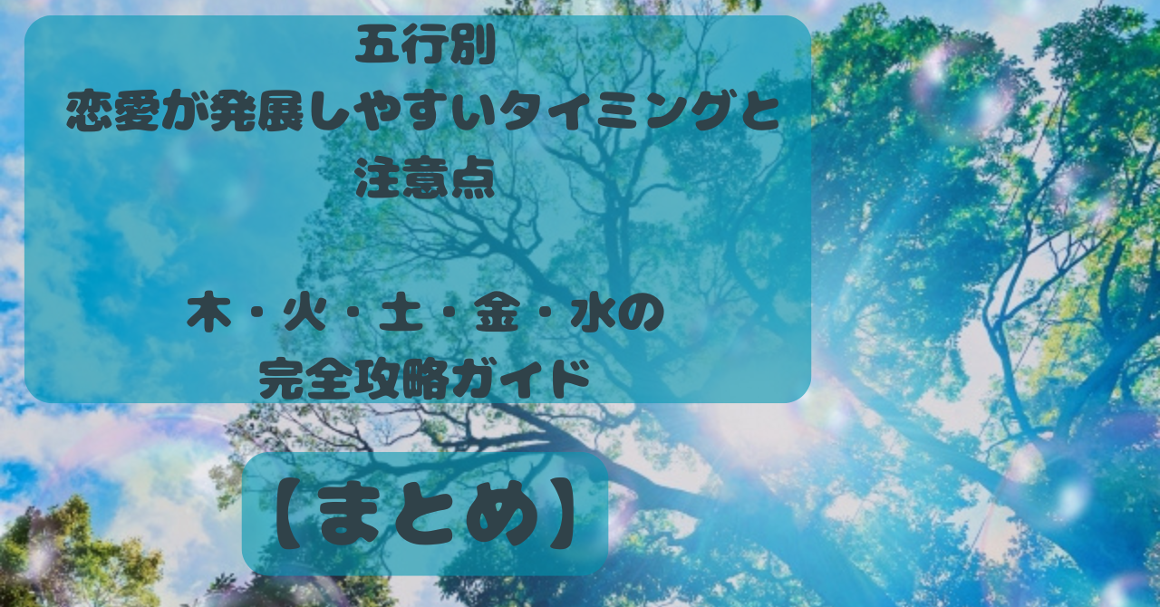 この記事では、木・火・土・金・水の五行別に恋が発展しやすいタイミング、サイン、注意点、さらに具体的な行動例まで詳しく解説します。恋愛の進展を自然にスムーズにするための、五行別完全攻略ガイドです。